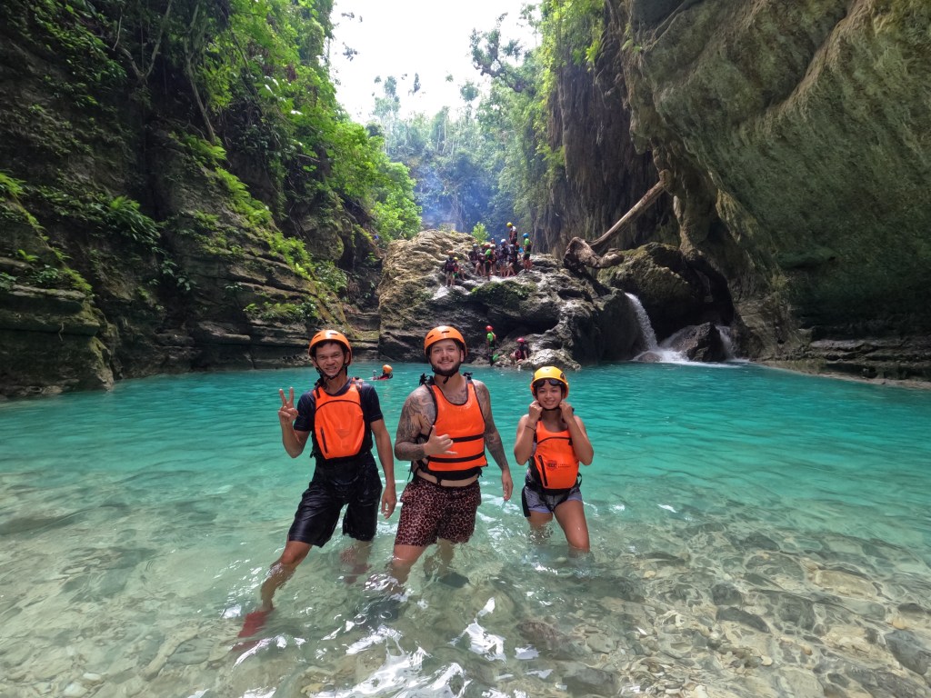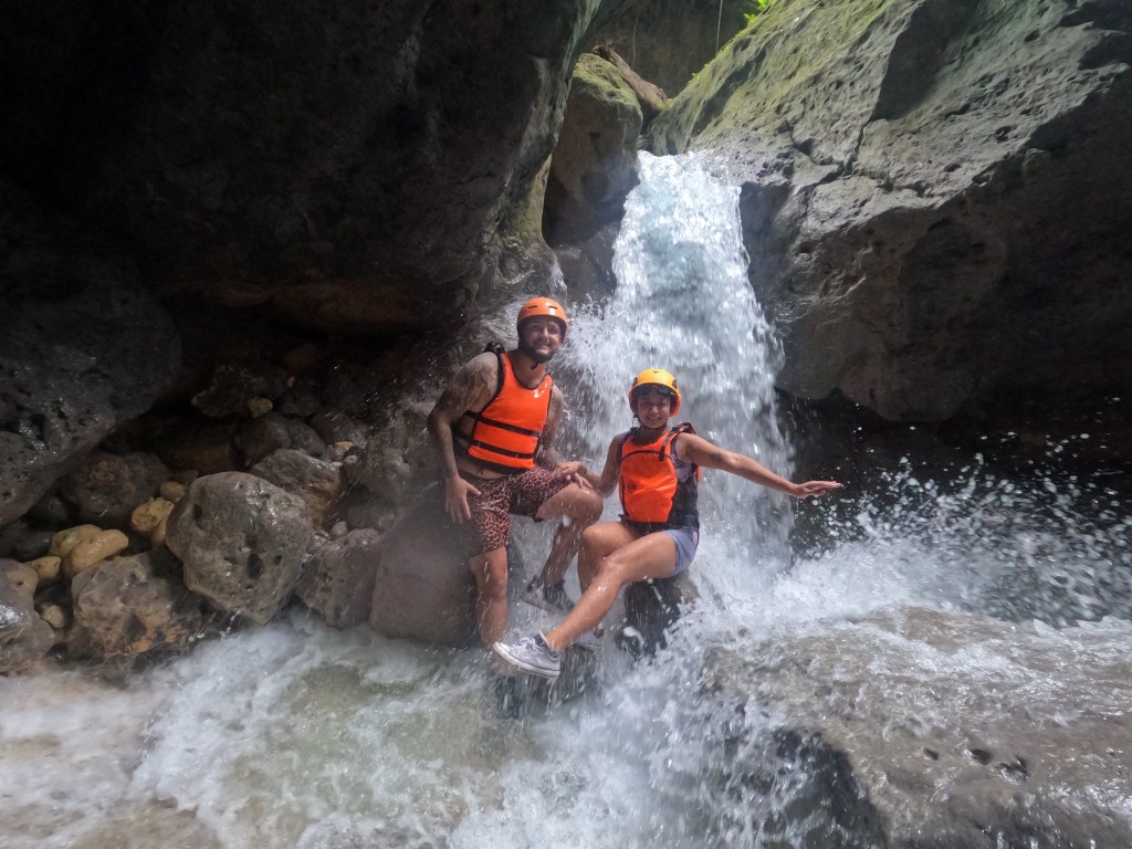 - This tour started out as a small hike and the majority of it took place in the water. There were multiple waterfalls and points where you could swing and jump off the ropes or jump off cliffs. At midpoint, Tim and I enjoyed some Filipino BBQ skewers, rice and beer.