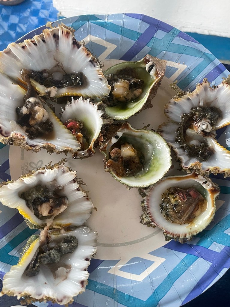 - Fresh seafood, picked up during our boat ride and cooked in the sand