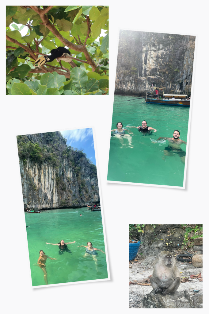 - Phi Phi Island, boat tour + monkeys + Rai Ley Beach + funky bird in the tree + tried unique Thai flavored chips, sunset, snorkeling (which made me super sick from the crazy waves and water motion)